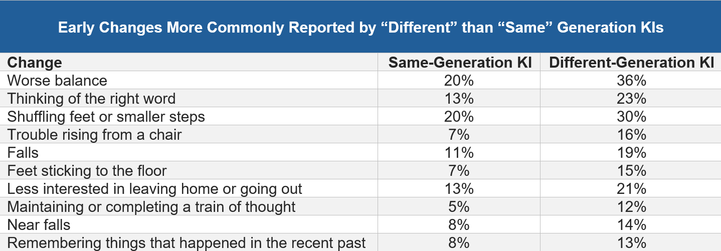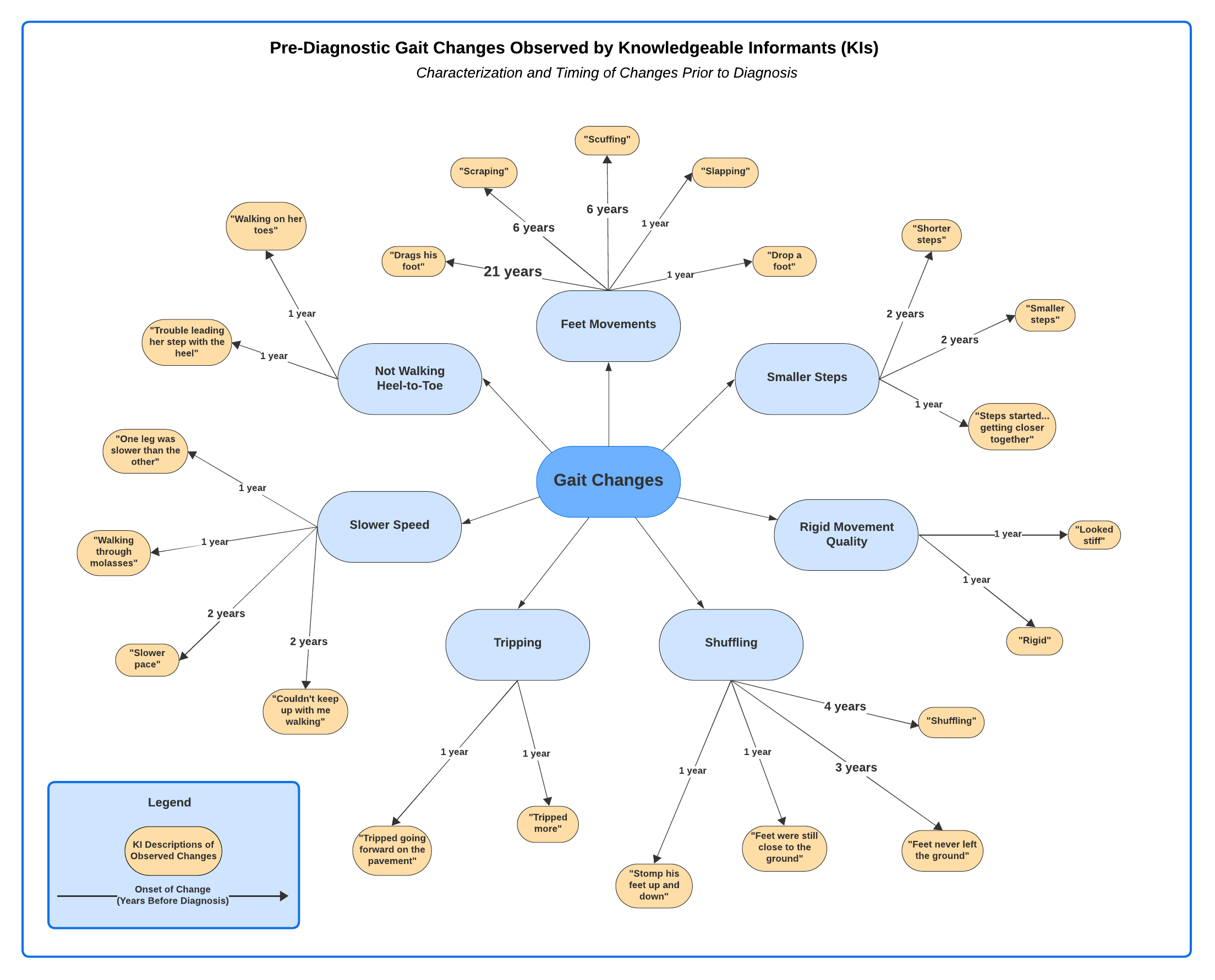 Results: 1860 KIs and 5549 PwPD completed the survey [Table 1], with 63 KIs participating in interviews. KIs reported certain prodromal features more frequently than PwPD and reported them emerging four or more years before diagnosis: difficulty using new gadgets or machines (KI: 45%, PwPD: 33%), trouble keeping track of time (KI: 41%, PwPD: 33%), and reduced task persistence (KI: 39%, PwPD: 34%) [Figure 1]. KIs also observed changes in PwPD occurring more than 10 years before diagnosis at higher rates than PwPD-reported changes, e.g., excessive sweating (KI: 26%, PwPD: 20%). Inter-generational reporting differences were observed [Table 2], with KIs from a different generation than their PwPD reporting changes like worsening balance (36%) and shuffling feet or small steps (30%) more frequently than same-generation KIs (20% each). Overall, KIs demonstrated heightened recognition of certain observable changes compared to PwPD, particularly gait changes such as shuffling feet or small steps, which ranked 7th among KIs (23%) but 28th among PwPD (16%) [Figure 2]. Qualitative analysis further characterized KI observations of gait changes [Figure 3], with some changes first noticed up to 21 years preceding clinical diagnosis.