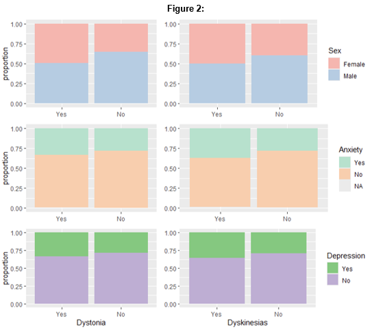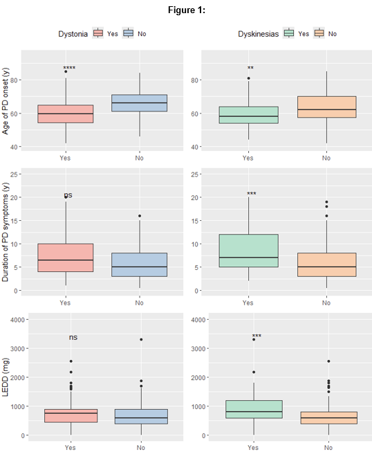 Results: 191 participants with PD (40% female) provided data on presence or absence of dystonia. Among those, 120 (63%) reported dystonia, 70 (35%) dyskinesias, and 47 (25%) both symptoms. Individuals with dystonia (p<0.001) and those with dyskinesias (p=0.03) were significantly younger at the time of PD motor symptom onset than those without. Duration of motor symptoms, time since PD diagnosis, and LEDD were not associated with presence of dystonia, but were strongly associated with levodopa-related dyskinesias (p<0.001) [figure1]. There were no differences based on sex, or presence of anxiety or depression symptoms [figure2].