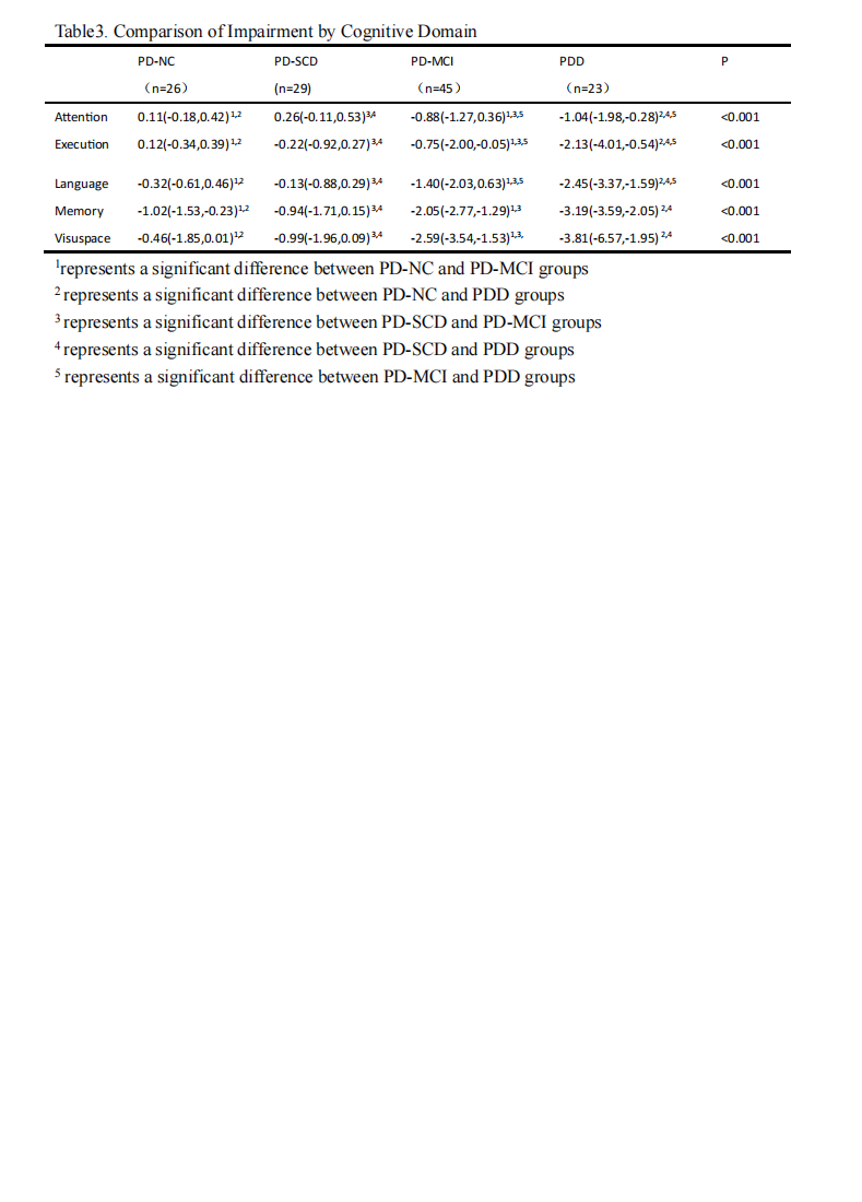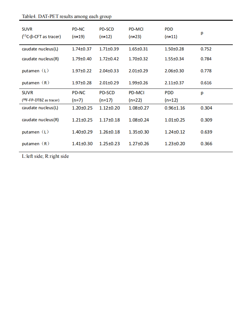 Method: A total of 147 patients with PD were enrolled in this study. Based on cognitive function assessments, patients were categorized into four groups: PD‐NC(n = 34),PD‐SCD(n = 33) ,PD‐MCI( n = 57), and PDD( n = 23). Baseline clinical data were collected, and all patients underwent dual positron emission tomography (PET) imaging using DAT‐PET—with either DTBZ or CFT as the imaging agent—and FDG‐PET to assess brain imaging characteristics associated with cognitive function in PD.