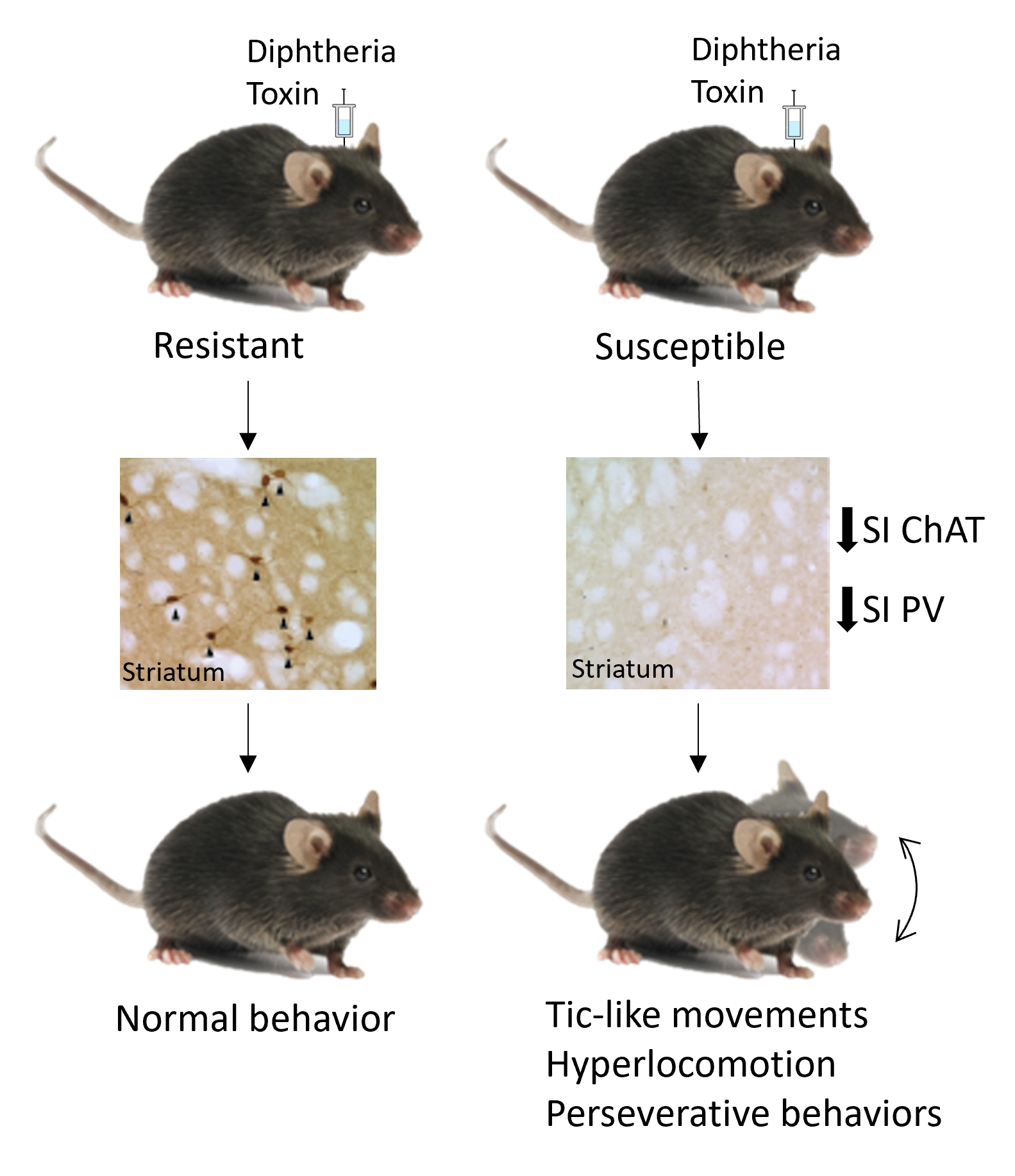 Method: In order to reproduce more closely the striatal changes reported in patients, we performed a combined ablation of multiple SI subtypes using a Cre/loxP transgenic system to express human diphtheria toxin receptor (hDTR) in the Nkx2.1+ cell lineage. Intrastriatal diphtheria toxin (DT) administration produced a specific ablation of Nkx2.1+ SI in mice expressing hDTR but not in control Cre- mice. We developed a Mouse Tic Severity Scale (MTSS) based on the Yale Tics Severity Scale used in clinical settings to measure motor tics [11].