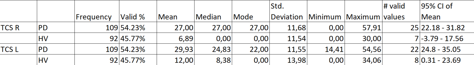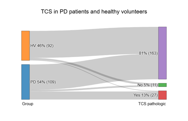 Results: The study included 201 participants, comprising 92 relatively healthy controls and 109 patients with PD. TCS was performed to assess HE in the SN. In the control group, 8 individuals (8.7%) exhibited HE, with 2 (2.2%) showing pathologically increased SN HE (exceeding 20 mm²). In contrast, 30 PD patients (27.5%) demonstrated HE, with 5 (4.6%) having values below the 20 mm² threshold (Fig. 1).
