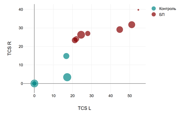 The numerical features of SN HE are detailed in Table 1, while the correlation between the sizes of HE in the right and left SN is illustrated in Fig. 2. Logistic regression analysis was conducted to evaluate the predictive value of pathological TCS findings for PD. The model was statistically significant (Chi²(1)=20.95, p<.001, n=197). The coefficient for pathological TCS (b=2.55) indicated a positive association, meaning that the presence of pathological TCS findings significantly increased the likelihood of PD. The odds ratio of 12.8 (p=.001) demonstrated that individuals with pathological TCS findings were 12.8 times more likely to have PD compared to those without such findings.