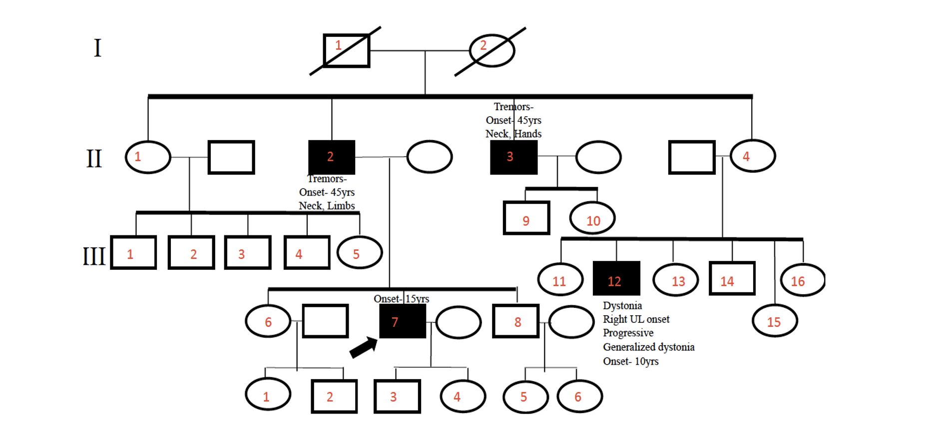 Results: A 33-year-old male from non-consanguineous parents, with normal birth and development, reported experiencing head tremors and left upper limb tremors since he was 15 years old (for 18 years). He also displayed abnormal posturing in his left lower limb for 7 years, had difficulties writing for the last 2 years, and showed abnormal trunk posturing over the past 6 months. A trial of levodopa/carbidopa proved ineffective. Notably, the family history revealed three affected members [Figure-1].