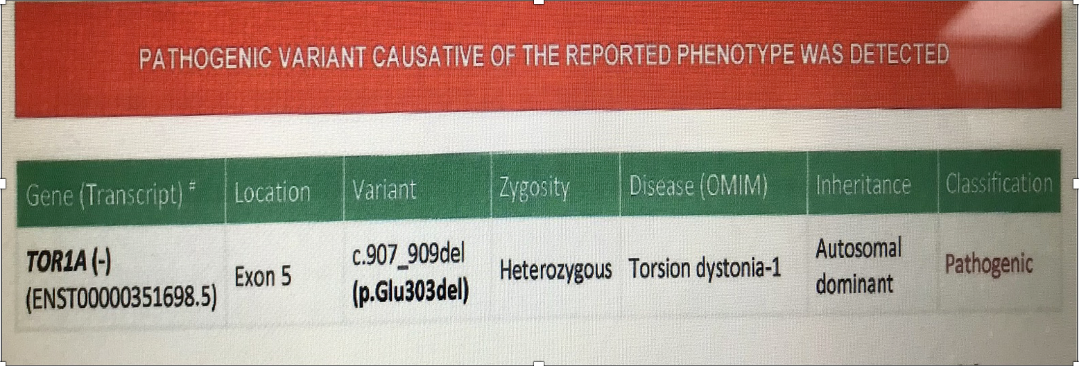 Examination revealed postural tremors in the head, along with kinetic and postural tremors in the upper limbs, and more pronounced dystonic posturing in the left upper limb compared to the right. Tremors were also detected in the left foot, accompanied by dystonic posturing, truncal dystonia, and mild neck posturing. Brain MRI results were normal, while whole exome sequencing revealed a pathogenic variant c.907_909delGAG in DYT-TOR1A [Figure 2]