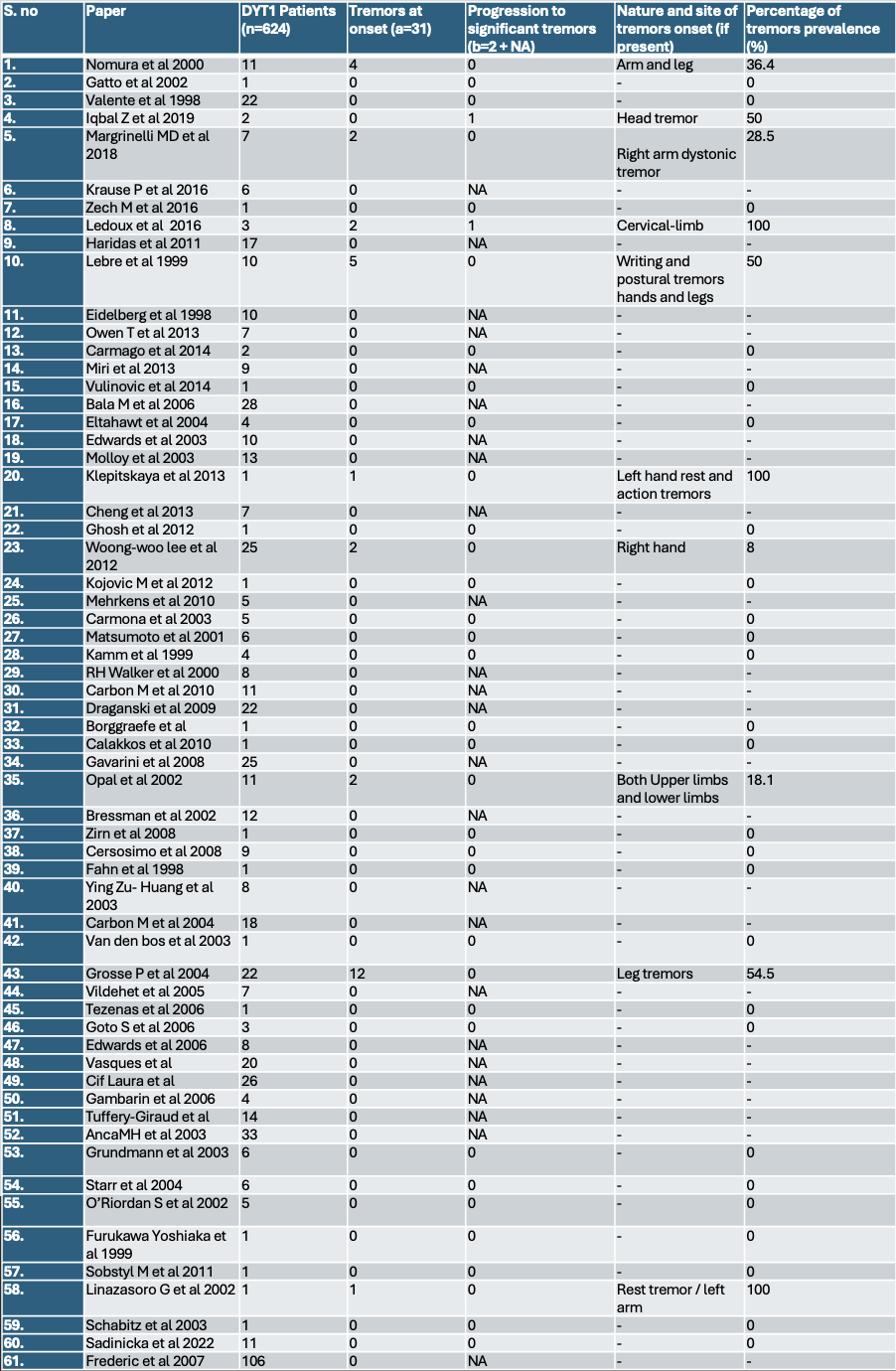 We identified and analyzed 61 articles involving 624 patients with genetically confirmed DYT-TOR1A. Among these patients, 31 (4.9%) exhibited predominant tremors at the onset of symptoms [Figure 3]. Predominant head tremors are rarely mentioned in the literature.