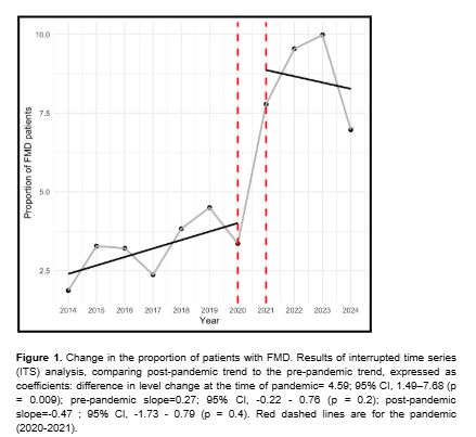 Results: Among 28722 total consultations (2014-2024), 163 were FMD: 22 pre-pandemic, 51 post-pandemic.The proportion of FMD patients is presented in [table 1]. Before the pandemic, yearly FMD slopes increased gradually (1.46 and 0.67) whereas post-pandemic, it abruptly increased to 4.42. ITS analysis revealed a weak pre-pandemic  upward trend in FMD cases (p=0.2), a sudden rise immediately afterward (level change: 4.59;p<0.05, 95% CI:1.49–7.68), and an apparent tendency to return to pre-pandemic rates (p=0.4) [figure 1].