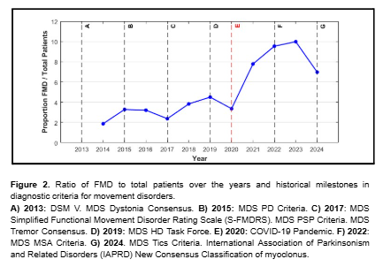Objective: To analyze the incidence of Functional Movement Disorders(FMD) consultations before, during and after the COVID-19 pandemic, and the impact of published diagnostic criteria for FMD.