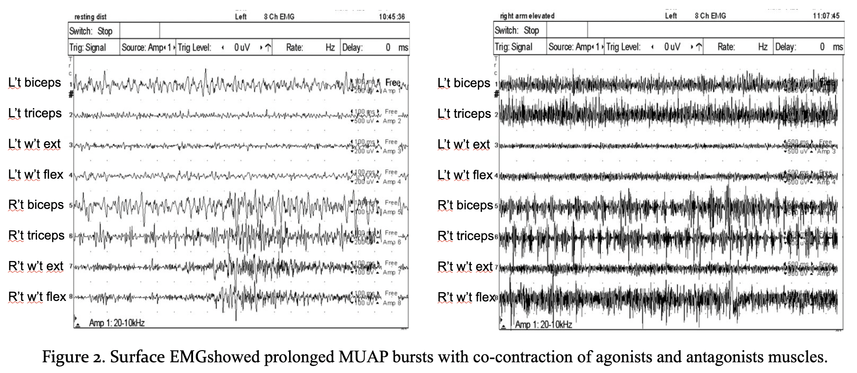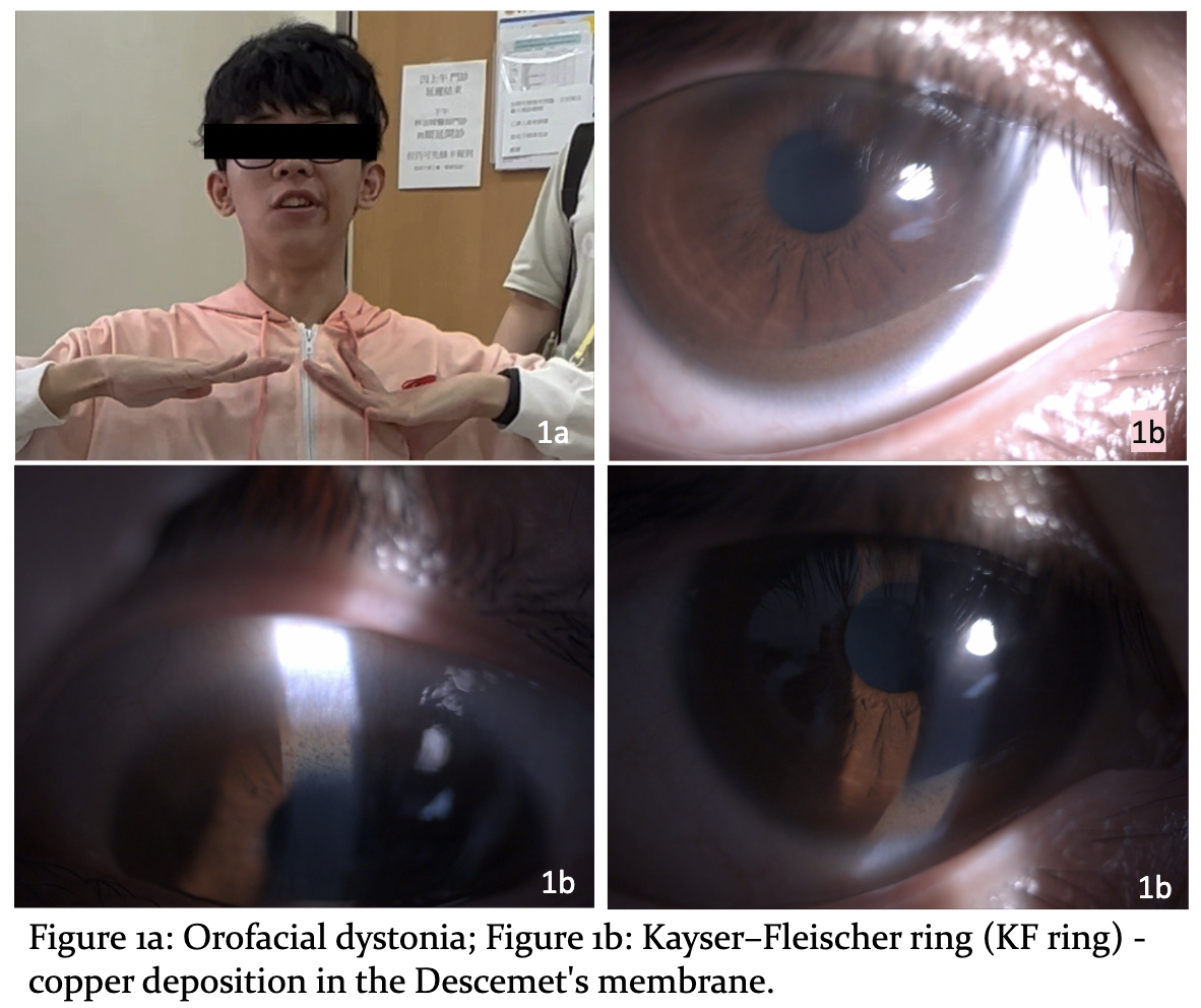 Results: A 24-year-old male, without prior systemic disease, contracted COVID-19 in June 2022. Within few days, he presented with excessive drooling, mild slurred speech, asymmetric facial expressions, and mild fluctuating right limb incoordination and clumsiness which exaggerated after exercise. In early 2023, he experienced 2 episodes of transient worsening neurological symptoms including: right limbs hemi-dystonia, chorea/ballism, spasmodic dysphonia and swallowing difficulties reported after physical exhaustion and respiratory infections. It was not until April 2023 when his left limbs were also involved that he sought for medical attention. Other neurological examination revealed mild memory and calculation impairment, orofacial dystonia, ataxia and presence of Kayser–Fleischer rings [figure1]. Laboratory results showed decreased ceruloplasmin (3.0 mg/dL), decreased serum copper (38 µg/dL), and elevated free copper (29 µg/dL) and urine copper (235 µg). Surface EMG of both upper limbs showed prolonged MUAP bursts with co-contraction of agonists and antagonists muscles [figure2]. Brain MRI revealed T2 FLAIR hyperintensities in the putamen, caudate nucleus, posterior limb of the internal capsule, midbrain, and pons [figure3]. PCR direct sequencing for ATP7B mutation analysis identified two compound heterozygous mutations (c.2333G>T/p.R778L, c.2975C>T/p.P992L) [figure4]. Treatment with zinc acetate and Trientine stabilized his symptoms.