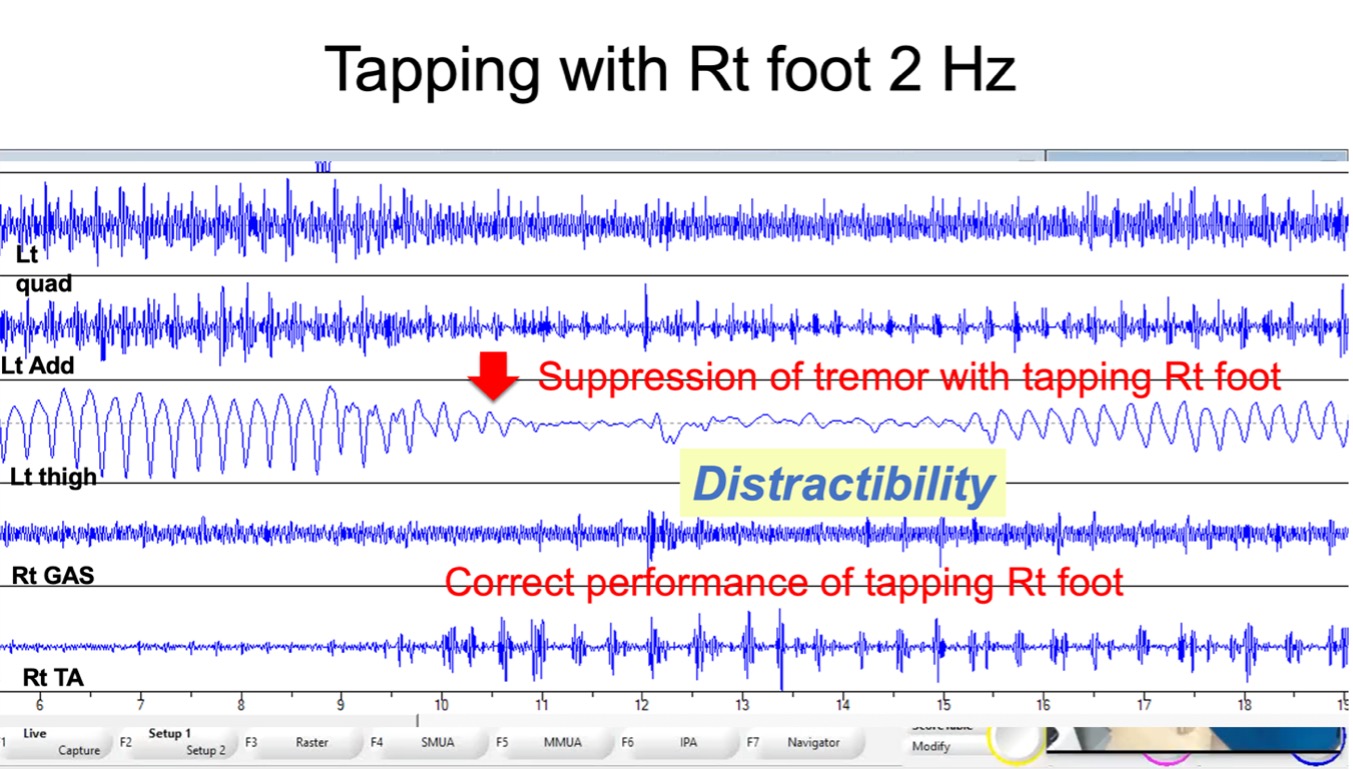Method: We present a case of a 62-year-old female presenting with subacute onset of bilateral lower extremity tremors at rest and standing, improving with walking. She has anxiety and multiple somatizations but no prodromal PD symptoms. Her tremor exhibited characteristics suggestive of FMD, including intermittent abduction-adduction leg tremors, with amplitude variability, suppressibility, distractibility, and entrainability. Neurophysiological studies showed tremor bursts without variability with synchronous EMG activity between the antagonist pairs, tremor suppression with contralateral hand tapping, and a high coherence between bilateral leg muscles [figure 1A-C]. A score of 3/10 was consistent with functional tremor (FT) based on laboratory-supported criteria (Schwingenschuh et al., 2011; Schwingenschuh et al., 2016). Although bradykinesia and rigidity were absent, reduced arm swing and suppression of leg tremors only with foot tapping, raised suspicion of underlying PD. An F-DOPA PET revealed decreased dopaminergic uptake in the left posterior putamen [figure 2]. A favorable levodopa response confirmed a coexisting neurodegenerative process.