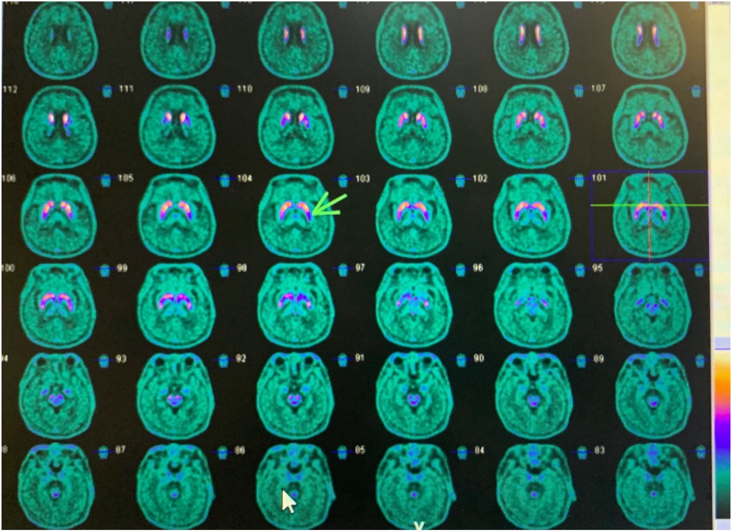 Figure 2.F-DOPA PET:Reduced uptake in left putamen