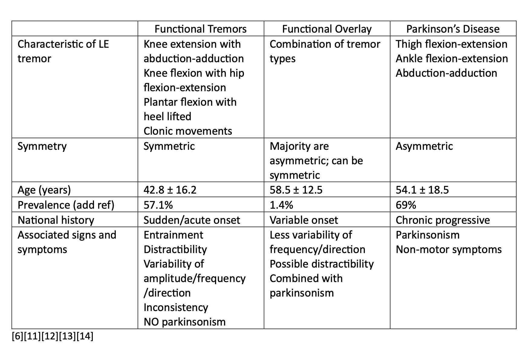 Results: Diagnosing movement disorders with functional overlay is complex. Lower limb tremors can be seen in PD, dystonic, and functional tremors, but coexisting parkinsonism aids PD diagnosis. Functional neuroimaging and neurophysiological studies help differentiate between functional and neurodegenerative causes. Emerging evidence suggests that FMD may precede or co-occur with PD, highlighting the need for careful evaluation.