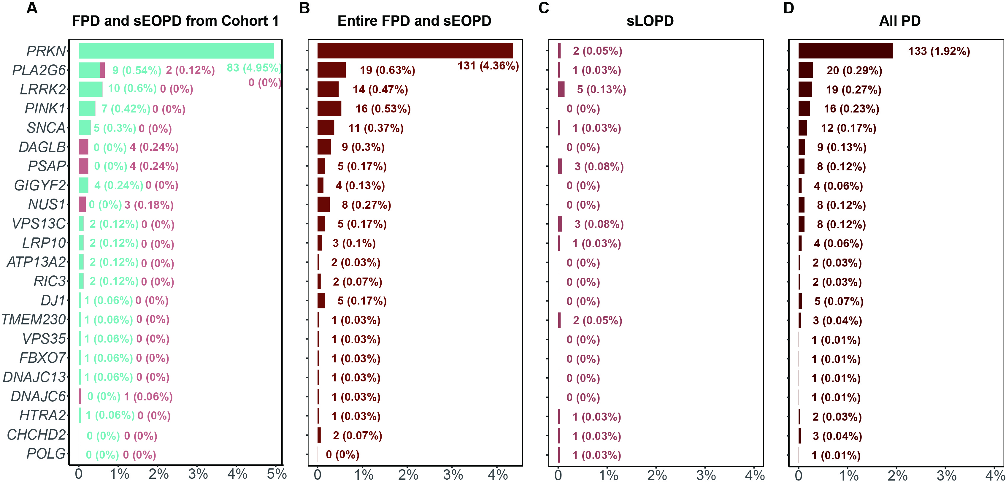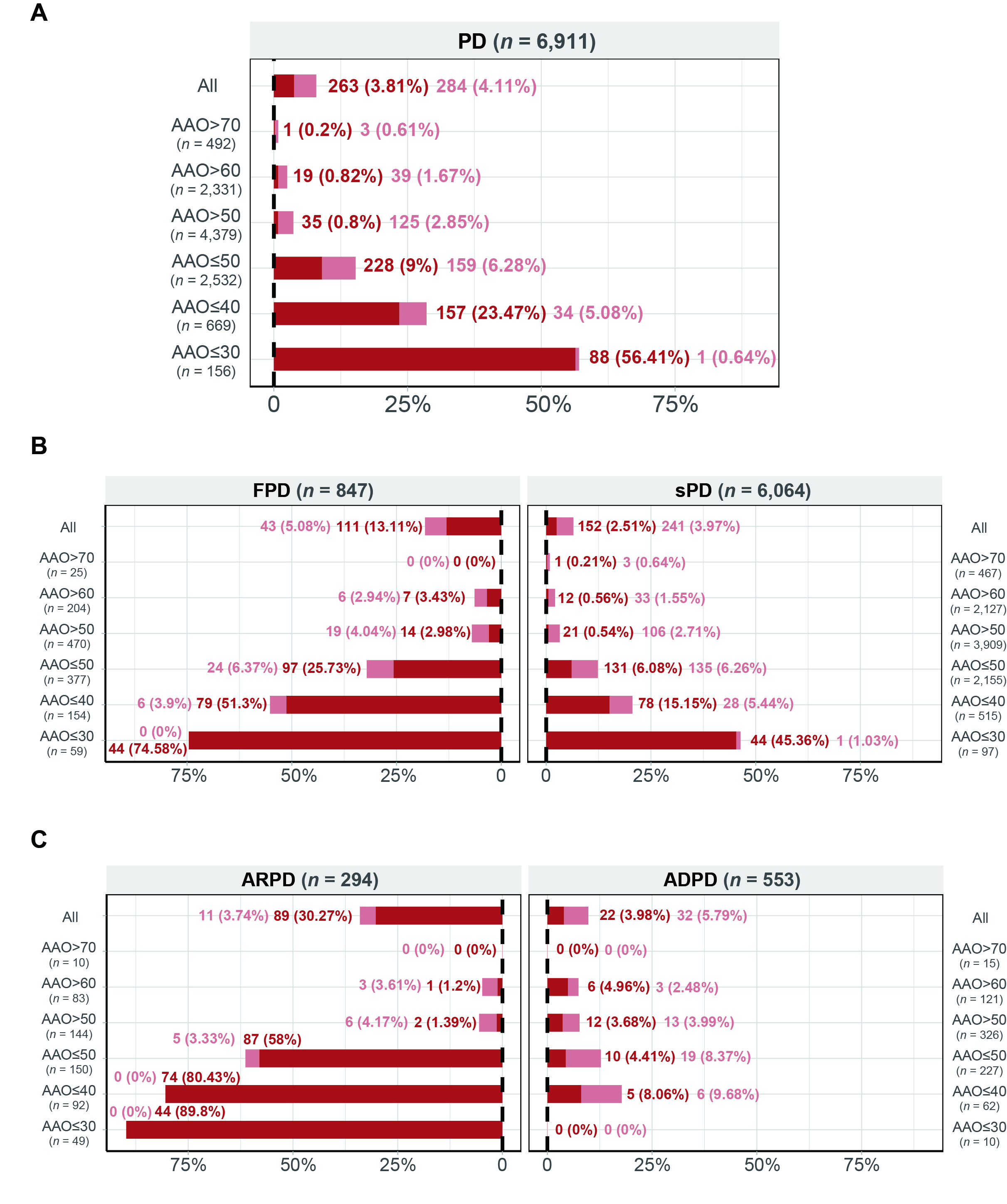 Method: We conducted a comprehensive genetic analysis of PD within a large, multicenter Chinese cohort comprising 6,911 unrelated PD patients (51.87% male; mean age-at-onset 54.72 ± 11.34 years old; 12.25% with positive family history). Utilizing multiplex ligation-dependent probe amplification (MLPA), whole-exome sequencing (WES) or whole-genome sequencing (WGS), we screened for variants in 35 established PD-associated genes, as well as 523 Movement disorders (MD)-associated genes.
