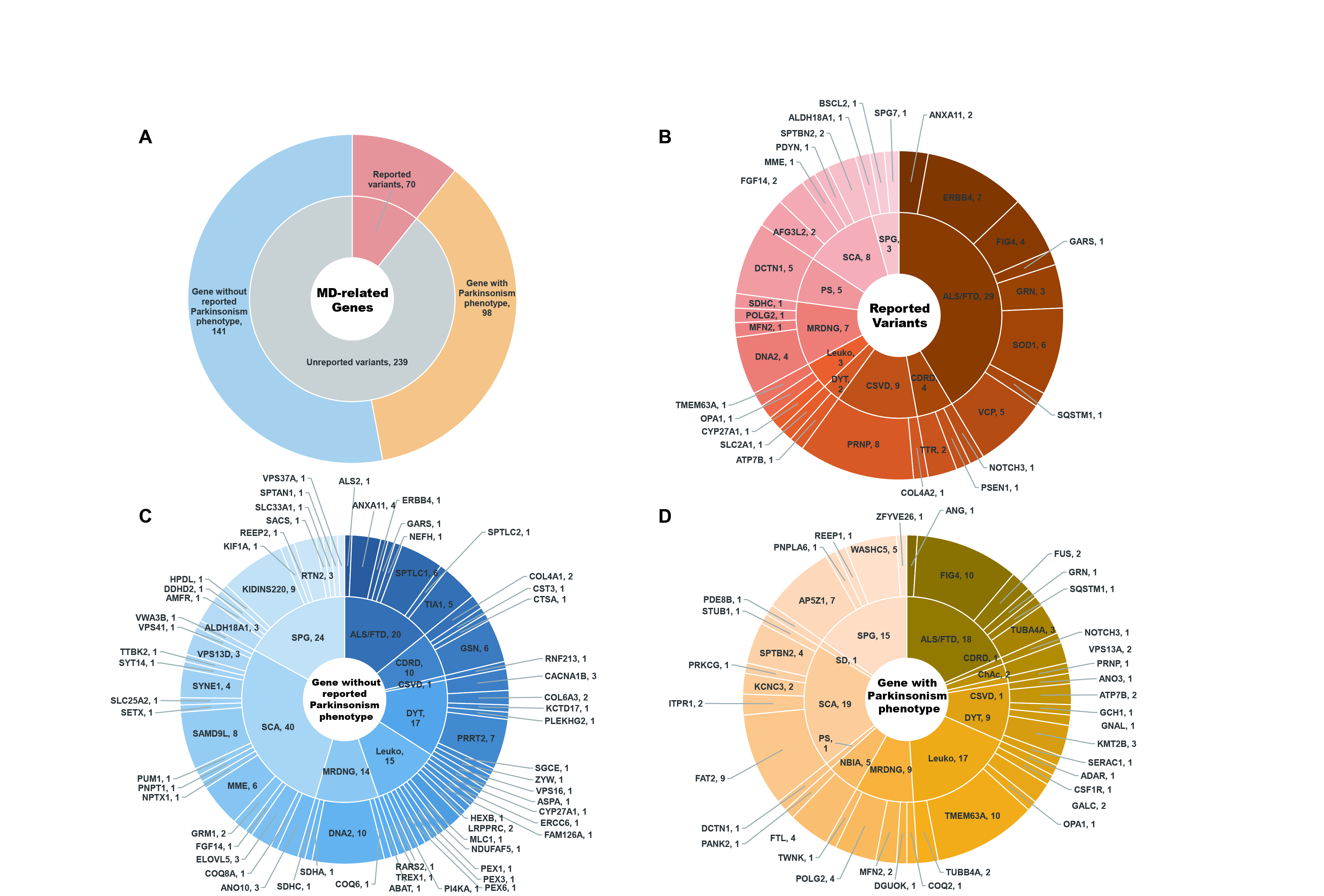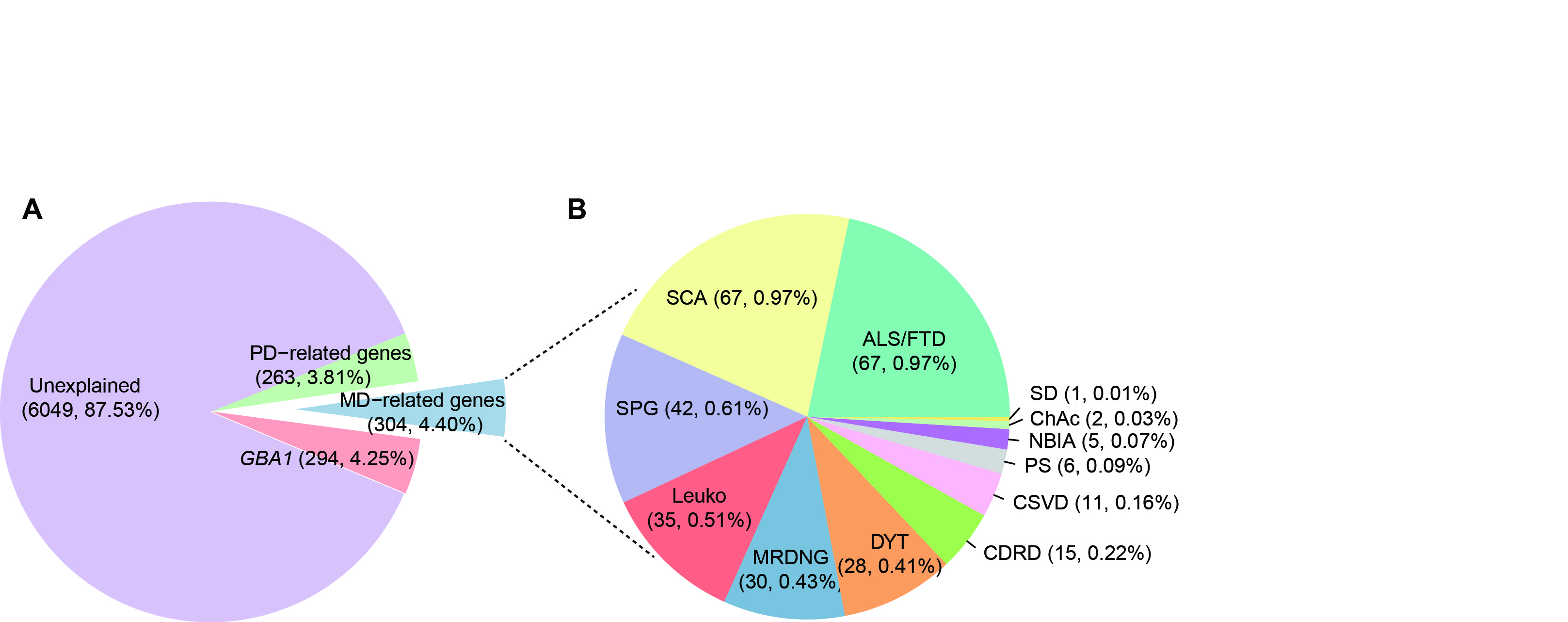 Results: We detected pathogenic or likely pathogenic variants in 263 (3.81%) patients across known PD-associated genes, with the most prevalent being PRKN (n = 133), PLA2G6 (n = 20), LRRK2 (n = 19), PINK1 (n = 16), SNCA (n = 12), and DAGLB (n = 9). Moreover, the median age-at-onset (MAO) for patients with a molecular diagnosis (median, 36.0 years) was approximately two decades earlier than those without a molecular diagnosis (median, 56.0 years). Furthermore, 284 (4.11%) patients harbored severe, mild, or risk variants in the GBA1 gene (median, 49.5 years) with an MAO about 6.5 years earlier. Additionally, 304 (4.40%) patients carried P/LP variants in MD-associated genes, including those related to Spinocerebellar ataxias (SCA) (n = 67), Frontotemporal dementia/ Amyotrophic lateral sclerosis (FTD/ALS) (n = 67), Spastic paraplegias (SPG) (n = 42). Of these, 70 variants had been previously reported, affecting 31 distinct genes.