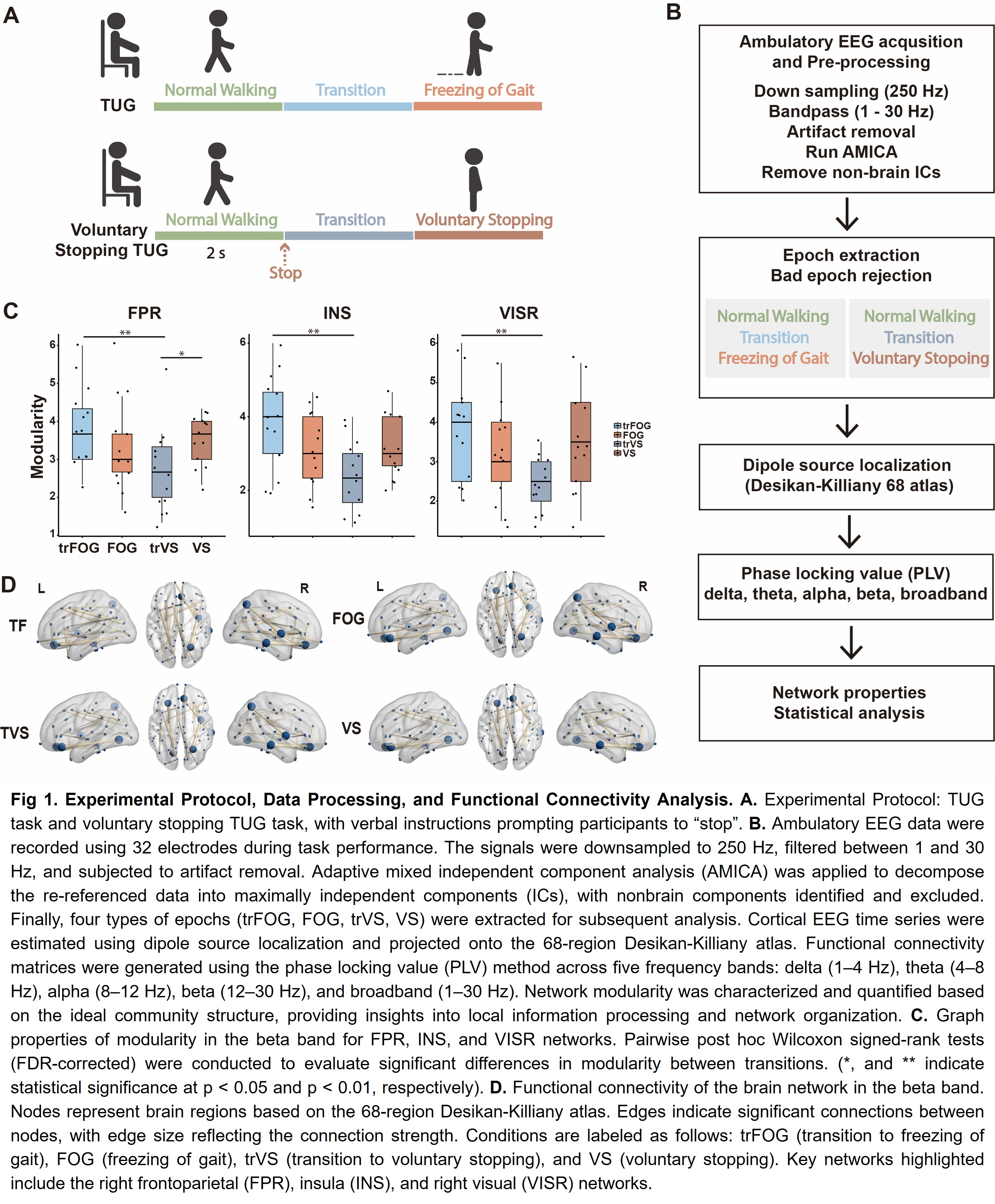 Method: Eighteen PD patients (69.6 ± 11.5 years) with varying FOG severity were assessed in their “Off” medication state. Motor measures (MDS-UPDRS III, Hoehn & Yahr) were recorded, and ambulatory EEG was acquired using a 32-channel BioSemi Active-Two system. Participants completed a Timed Up and Go (TUG) task and a voluntary stopping (VS) TUG task, halting upon a verbal “stop” command (Cao et al., 2021; Zampieri et al., 2010). Two trial types (FOG and VS) were analyzed, each comprising three 2-second epochs: Normal Walking (pre-transition), Transition (trFOG: before freezing; trVS: before voluntary stop), and FOG or VS. A total of 277 FOG and 51 VS trials were included (Fig 1A). Functional brain networks were estimated at the source level across four frequency bands. Graph theory-based modularity metrics were applied to compare network properties during transition states (trFOG/trVS) preceding FOG and VS events (Fig1B).