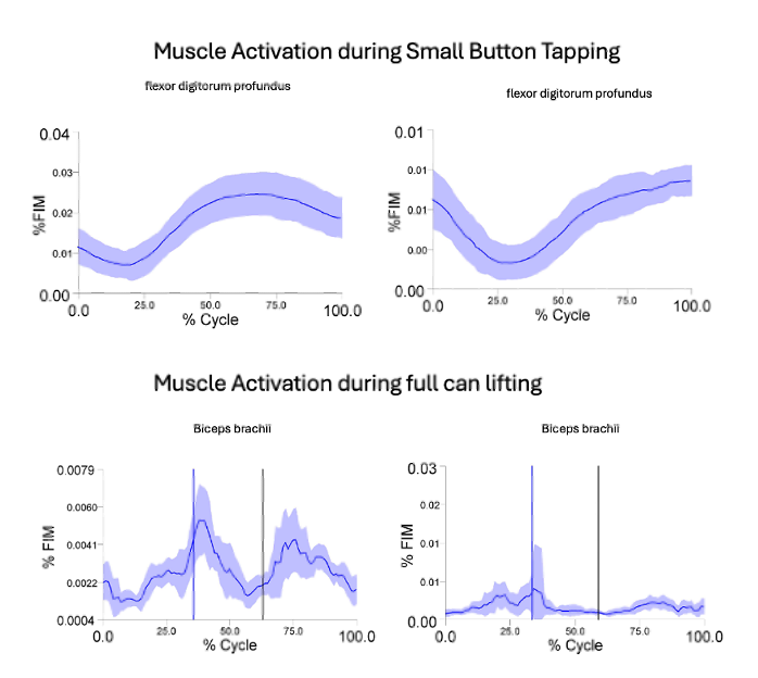 Results: The subject with PD demonstrated greater speed when moving obj1 and obj2, while the jerk (or pull; a derivative of acceleration) was 72% greater for obj1 in the control subject (Graphic1). For prono-supination at 90 degrees, the control subject exhibited a difference of 104% greater jerk, and the joint RoM was lower by 13º. While no differences in speed were observed when pressing the Bb buttons, the subject with PD exhibited a 69% increase in jerk, which was also elevated for the Bs. Superficial electromyography showed different muscle activation patterns (MAP) (Image1). The patient with Parkinson’s disease showed a persisting contraction of the flexor digitorum profundus during the button tasks compared to the healthy patient who showed only activation during movement, and a decreased muscle activity of the biceps (PD) when lifting the full can. No differences were found in joint goniometry across any of the evaluations.