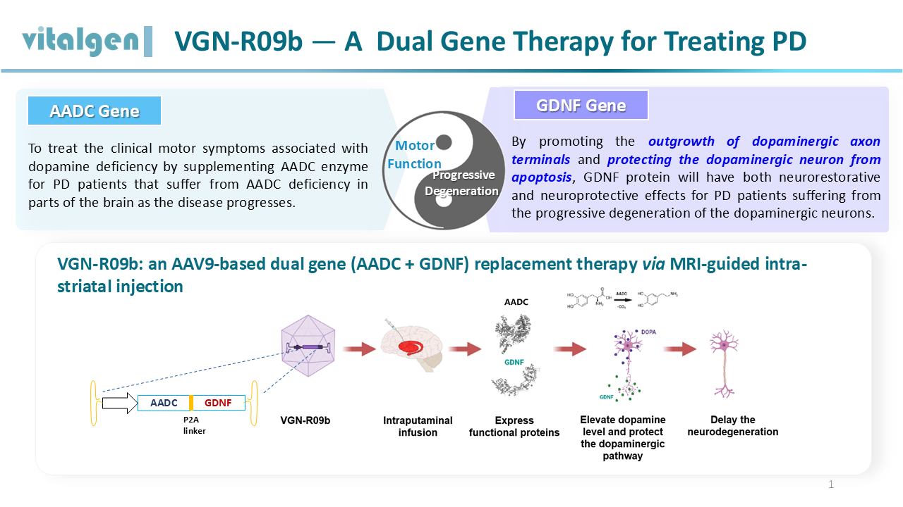We have developed VGN-R09b, an AAV9-based AADC and GDNF combination gene therapy that is delivered to the striatum via brain parenchymal injection for treating PD. The AADC would enhance dopamine levels to boost dopaminergic transmission and improve motor function. While GDNF would exert its neuroprotective effects to potentially slow or halt disease progression.