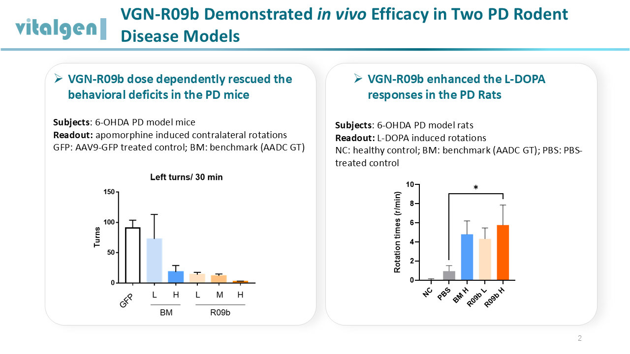 Method: Preclinical efficacy studies: VGN-R09b was injected to the striatum of 6-OHDA-induced PD mouse and rat models. The rotational behaviors in response to apomorphine and low-dose L-DOPA were then recorded and analyzed.