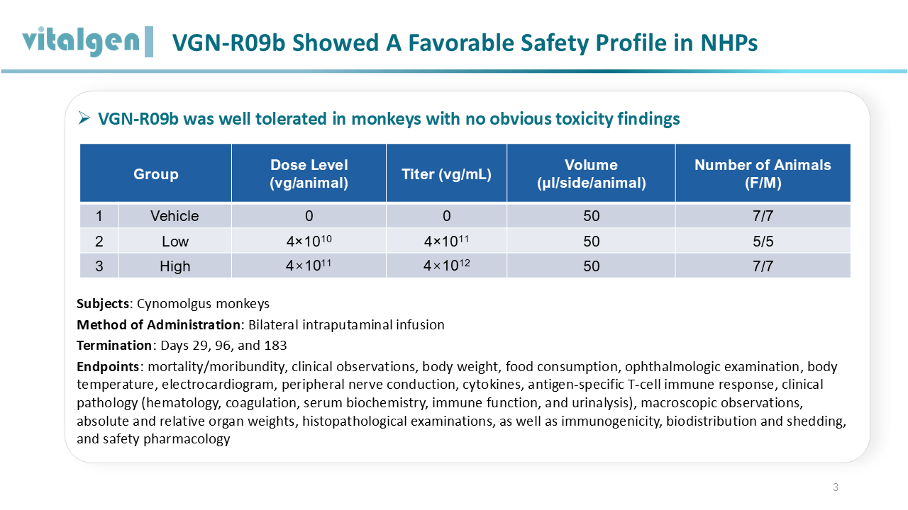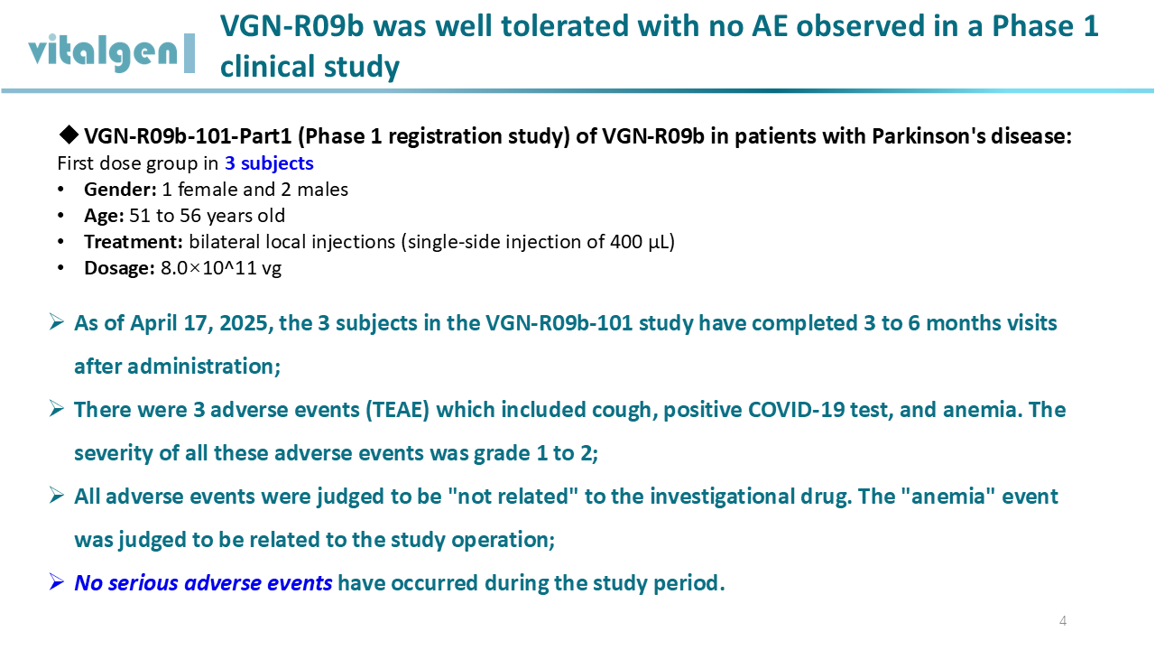 Phase 1 clinical study: Phase 1 registration study of VGN-R09b in PD patients has completed administration of the first dose group in 3 subjects (1 female and 2 males), whose ages at enrollment were 51 to 56 years old. They received bilateral local injections of the drug at a dosage of 8.0×10^11 vg.