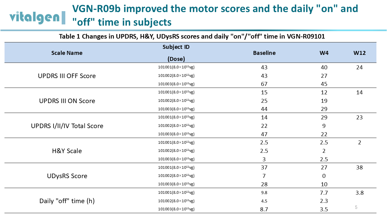 Results: Preclinical efficacy studies in two rodent PD models demonstrated that intra-striatal injection of VGN-R09b dose-dependently improved motor impairments, enhanced L-DOPA responsiveness, and protected dopaminergic terminals of PD animals. Toxicology studies of VGN-R09b revealed a favorable safety profile and identified human starting dose. In a Phase 1 clinical study, VGN-R09b was well tolerated with no AE observed and has improved the motor scores and the daily “on” and “off” time in study subjects.