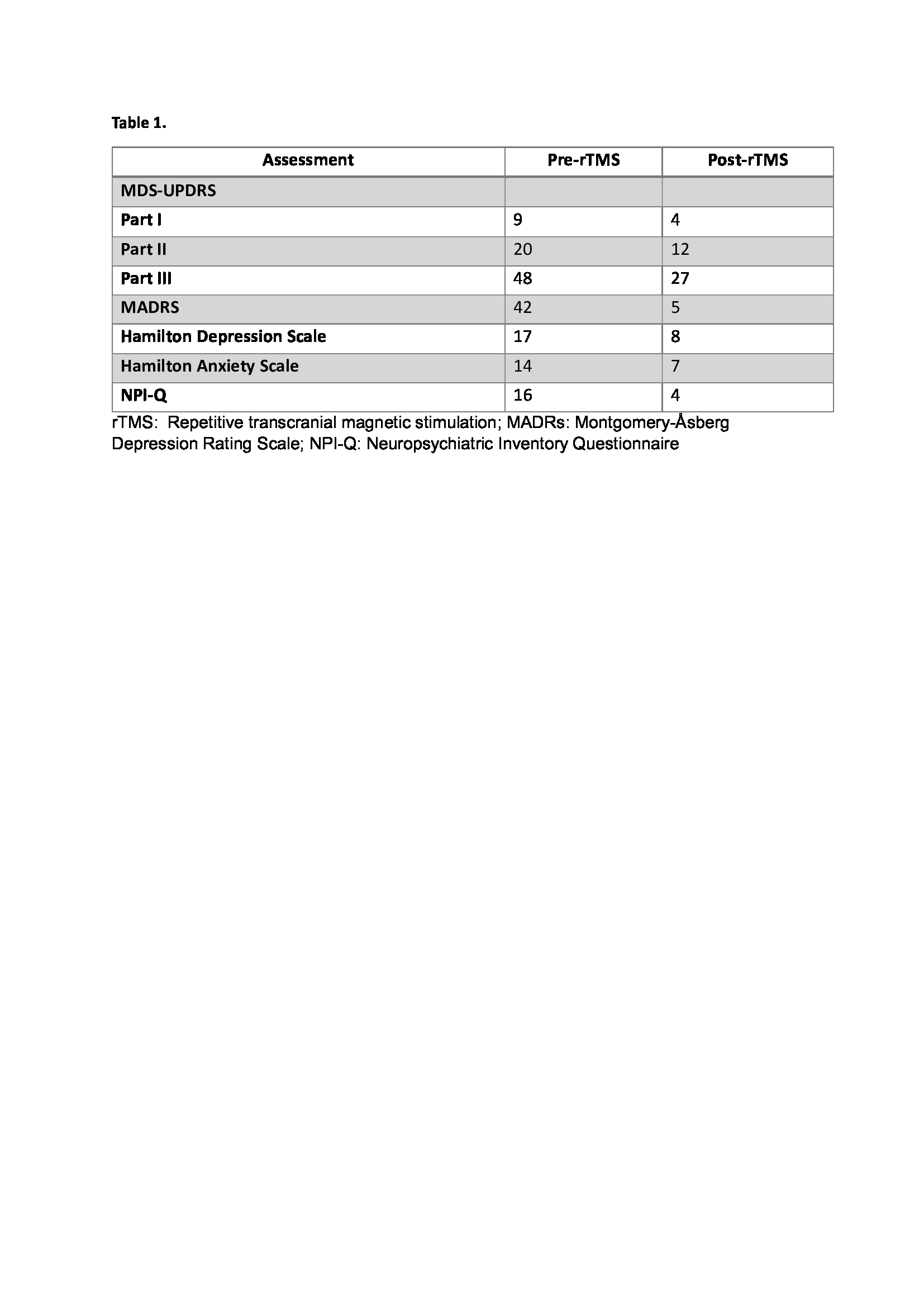 Results: Significant clinical improvement was observed after 15 sessions. MADRS scores decreased from 42 to 5, indicating substantial remission of depressive symptoms. Motor symptoms improved, with MDS-UPDRS Part III scores decreasing from 48 to 27, additional improvements were noted (Table 1). The patient reported reduced gait freezing and falls, leading to enhanced functional independence. Mild headache was the only reported side effect. These findings align with previous studies demonstrating the efficacy of rTMS in neurodegenerative diseases. Lefaucheur et al (2014)[1] reported motor improvements in Parkinson’s disease following DLPFC-targeted rTMS, while Brunoni et al (2017)[2] highlighted its effectiveness in treatment-resistant depression. Boggio et al (2006)[3]also observed improvements in gait and motor function with rTMS applied to motor-related cortical areas.